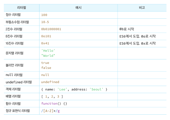 리터럴은 사람이 이해할 수 있는 **문자 또는 미리 약속된 기호 (' '," ", . , \[] , {} , // 등)로 표기한 코드**다. 자바스크립트 엔진은 코드가 실행되는 시점인 런타임에 리터럴을 평가해 값을 생성한다. 즉 리터럴은 값을 생성하기 위해 미리 약속한 표기법이라고 할 수 있다.